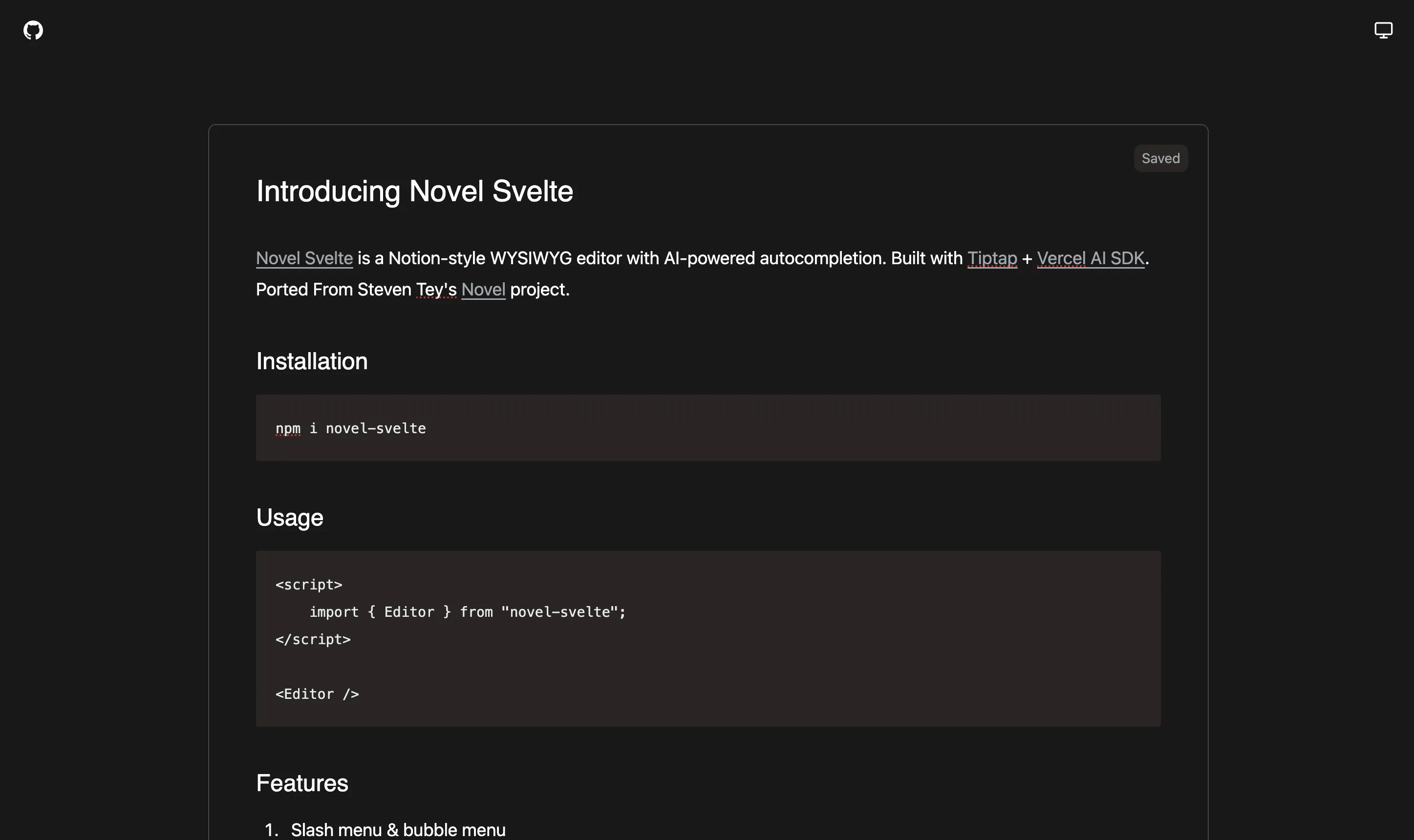 A port of Steven Tey's library, Novel, to Svelte. It's a Notion-style WYSIWYG editor, with AI-powered features.